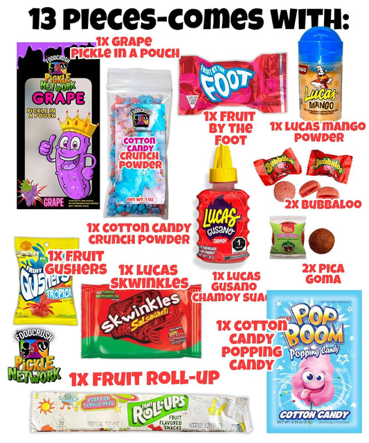 Grape Pickle Kit | Candy Gift Pouch-Gifts For Kids teens teen girl boy | w/Fruit Roll ups, skwinkles salsagheti, Lucas chamoy sauce, Mexican candy snacks Variety Pack Tiktok trend items by Food Crush